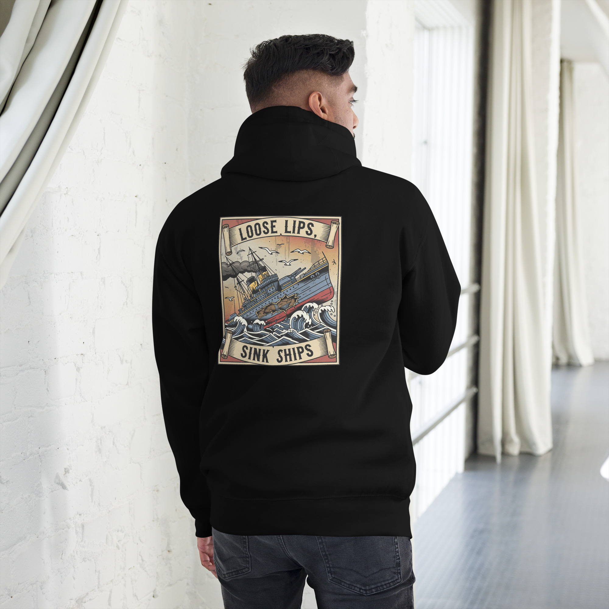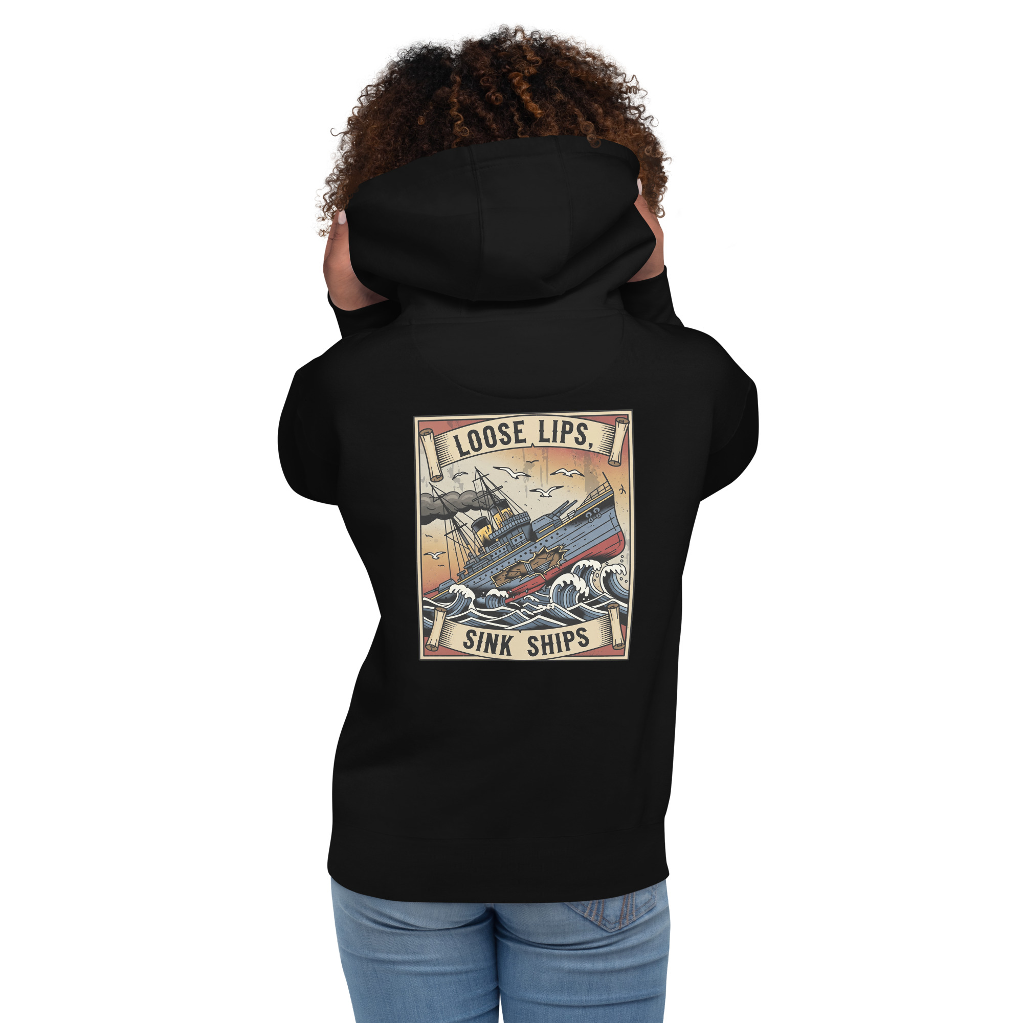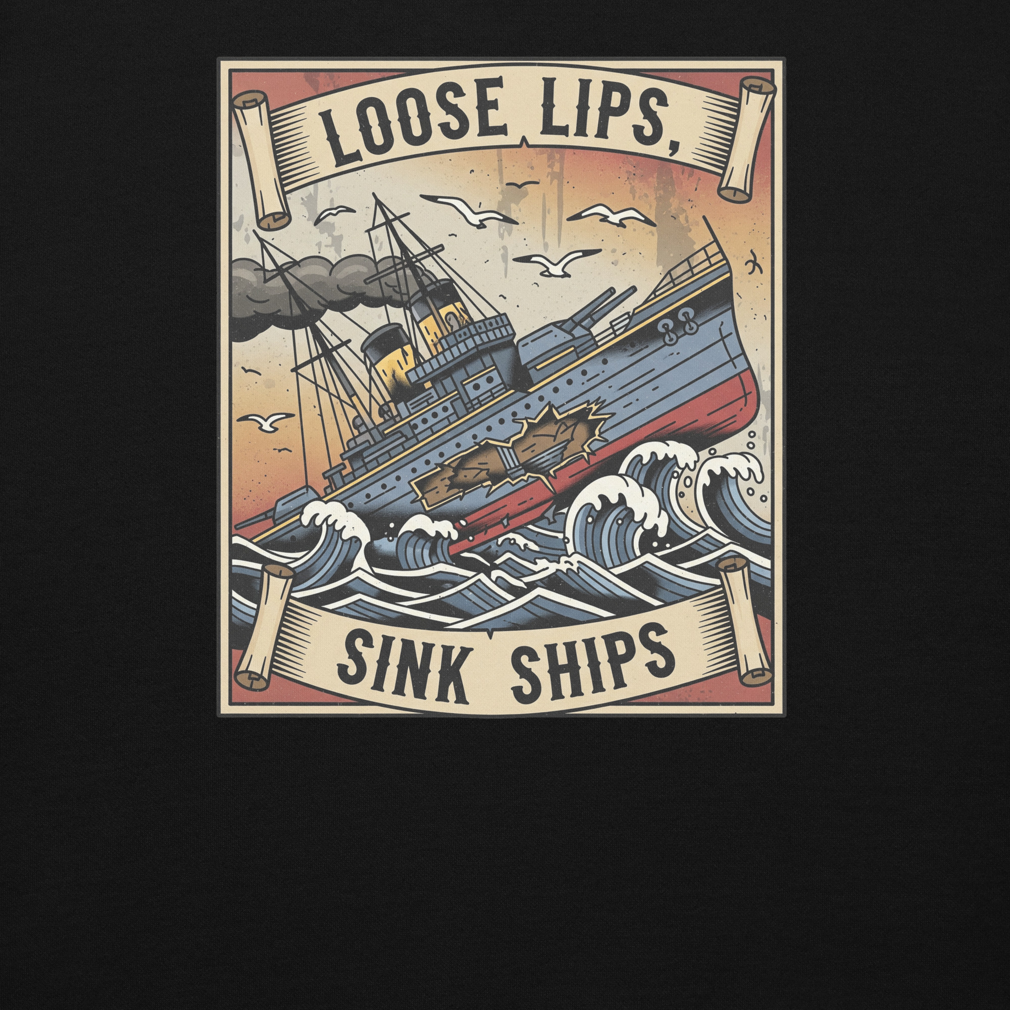 Classic wartime wisdom with a fresh back print. Bold ship art, rolling waves, and the line that still hits: loose lips sink ships. Vintage poster feel, clean lines, wearable message. Cozy fit for late nights and early starts. Limited drop so you will not twin with the whole high street.