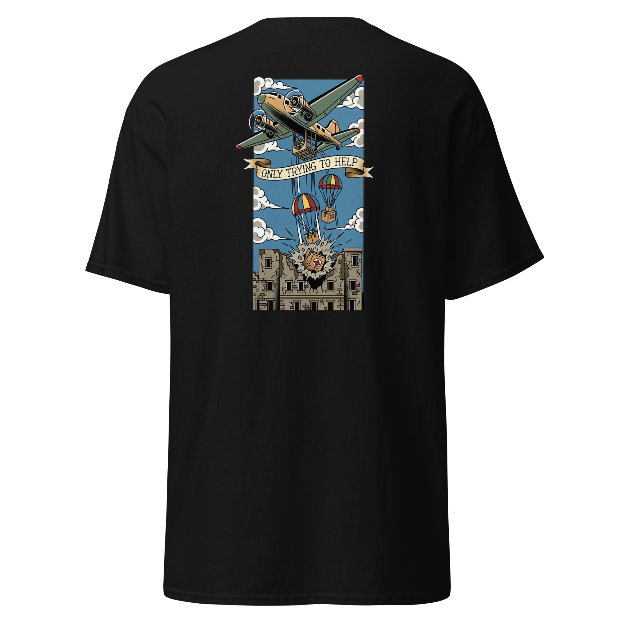 Sharp back print that says the quiet part out loud. Airdropped aid floats down while the ground tells a different story. Satire that questions whether help is actually helping. Clean line art. Conversation starter for people who care about people. Limited run so you will not twin with the whole high street.