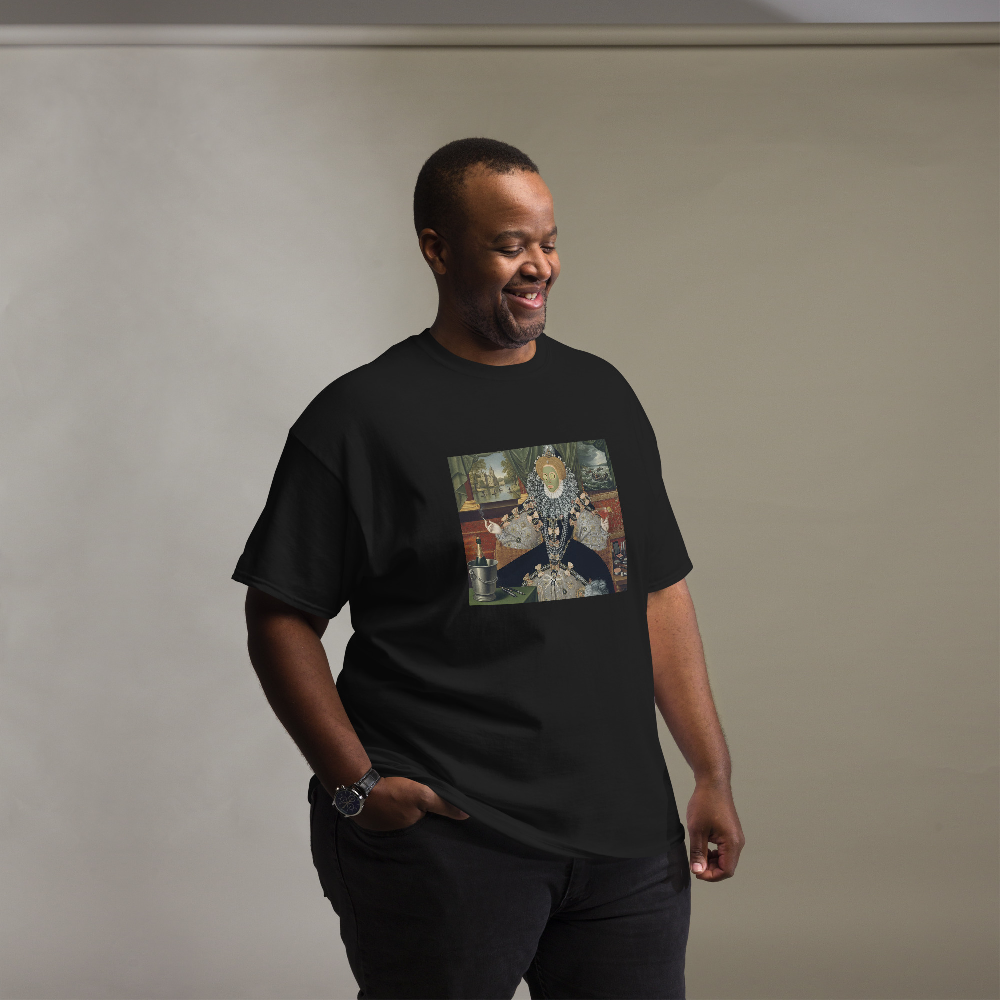 Regal portrait meets reality TV era. Queen Lizzie gets a sheet mask, champagne on ice, and a dressing table of twenty first century clutter. The background windows nod to modern Britain, from calm punts on the Cam to busy Channel waters. Old world opulence with a present day punchline.