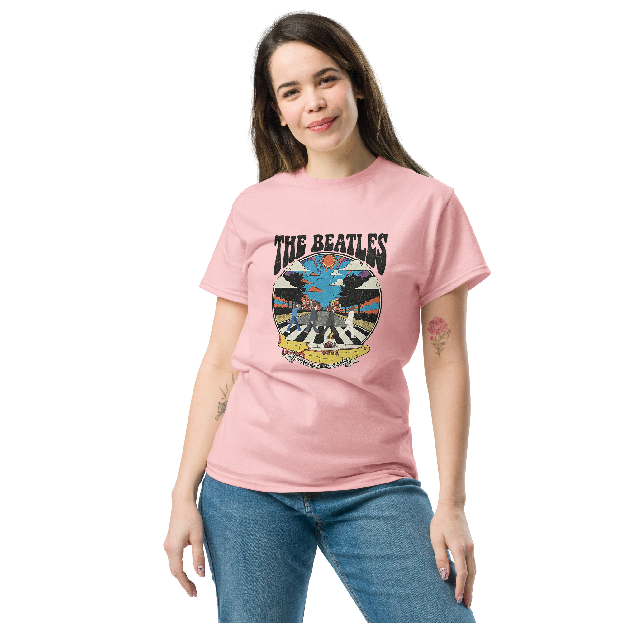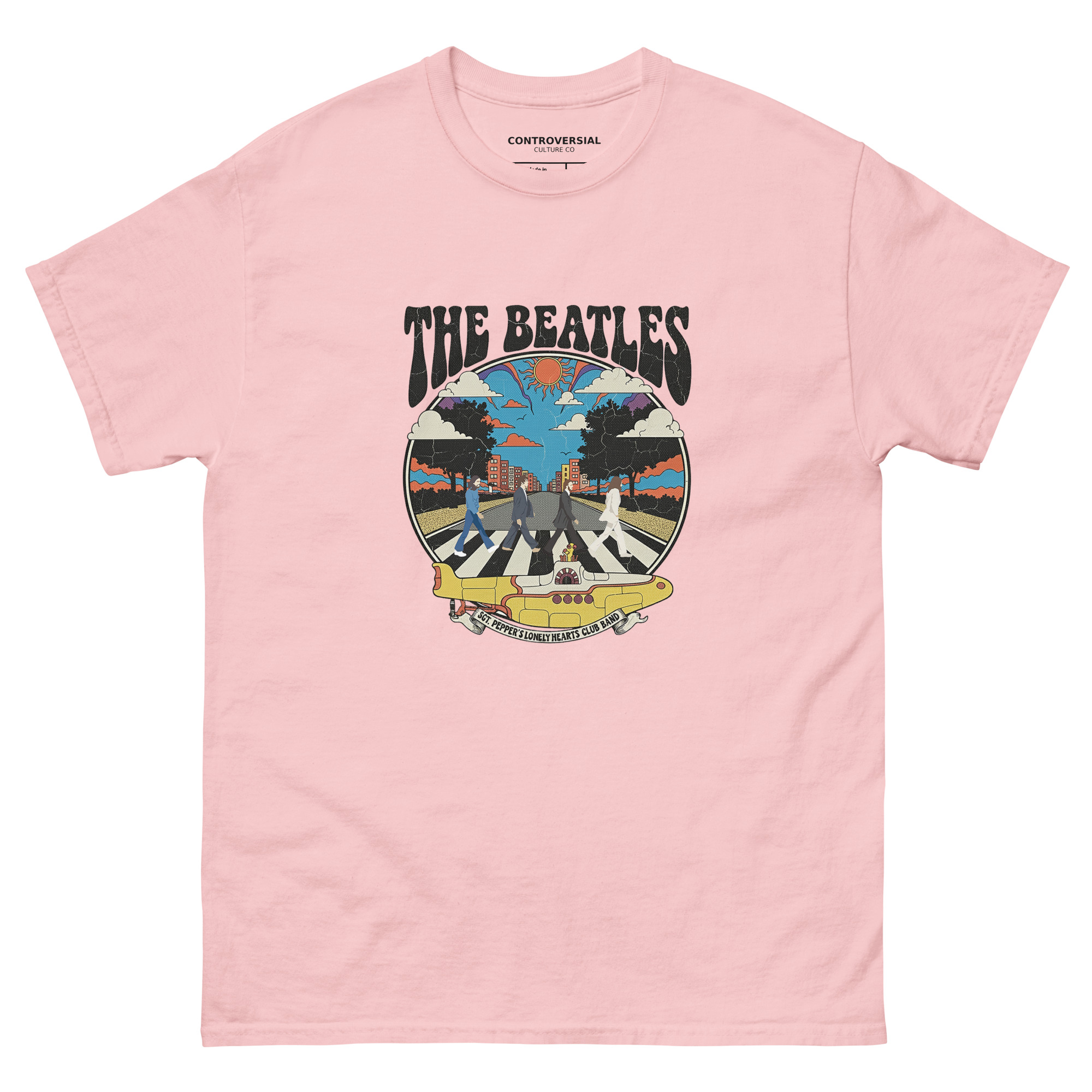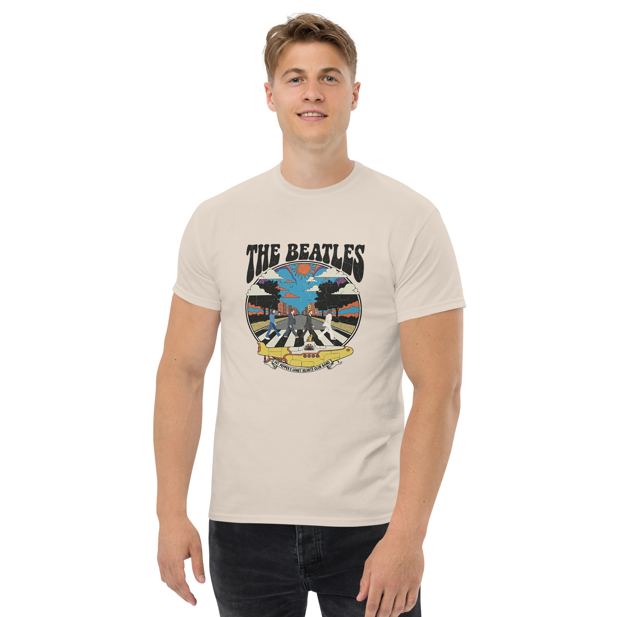 Sixties pop art energy with Abbey Road swagger. Bold crosswalk stride, Yellow Submarine wink, vintage tour-tee vibes. Clean print that looks record-shop fresh. Works solo with denim or under a jacket. Limited drop so you will not twin with the whole crowd.